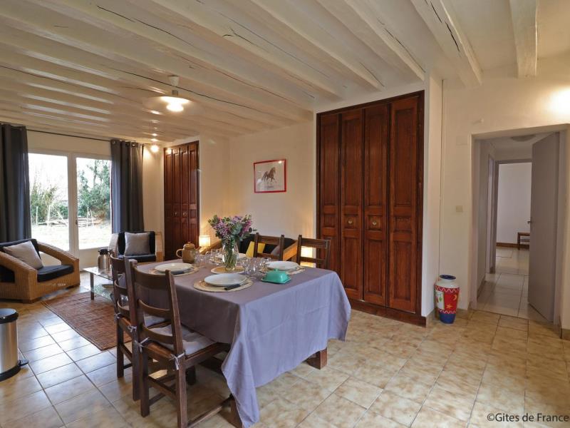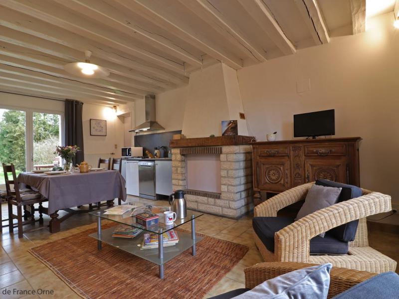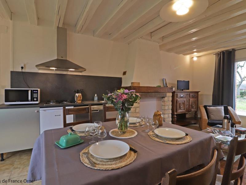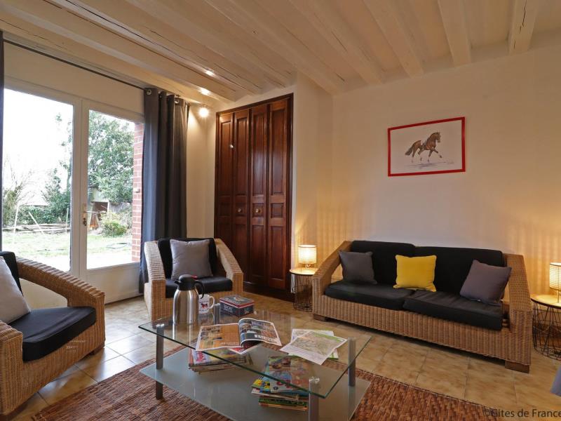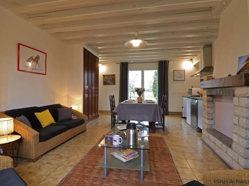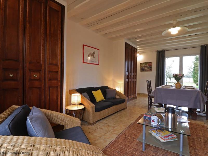 Maison de plain pied, mitoyenne aux propriétaires au sein d’une structure équestre : séjour avec cuisine équipée (four combiné micro-ondes) et coin salon (TV), 1 chambre (2 lits faits 80 cm x 190 jumelables), 1 chambre (2 lits faits 80 cm x 190 jumelables), salle d’eau avec wc et lave linge. Chauffage central. Jardin privatif 70 m² non clos et sans vis à vis avec terrasse. Potager.