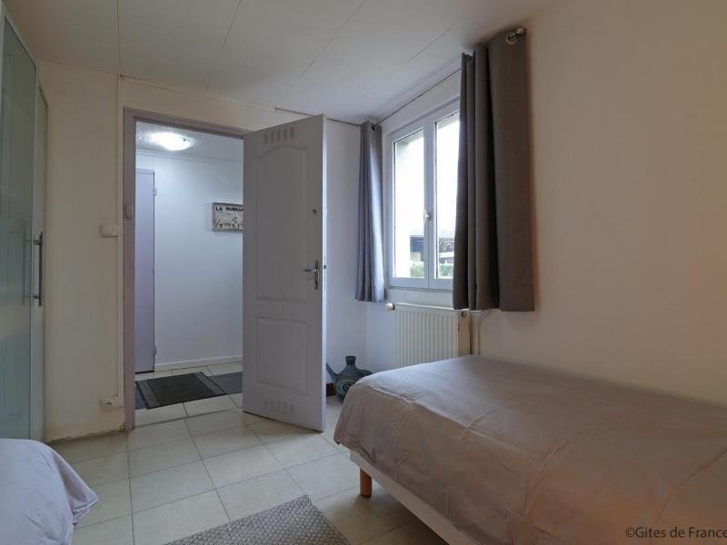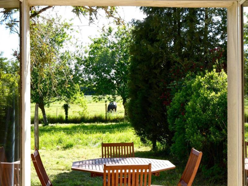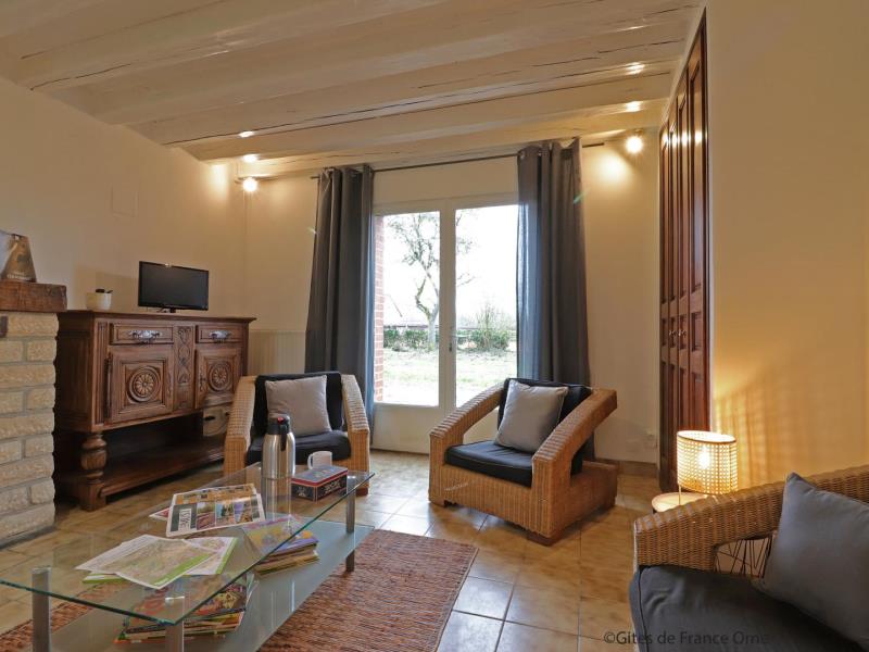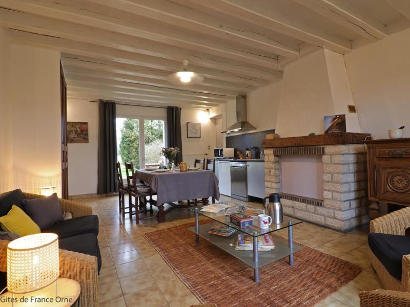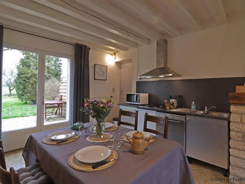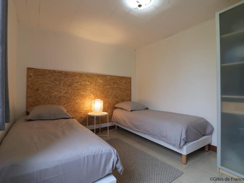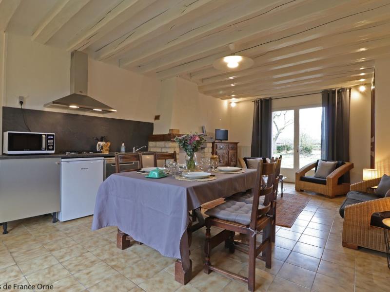 Maison de plain pied, mitoyenne aux propriétaires au sein d’une structure équestre : séjour avec cuisine équipée (four combiné micro-ondes) et coin salon (TV), 1 chambre (2 lits faits 80 cm x 190 jumelables), 1 chambre (2 lits faits 80 cm x 190 jumelables), salle d’eau avec wc et lave linge. Chauffage central. Jardin privatif 70 m² non clos et sans vis à vis avec terrasse. Potager.